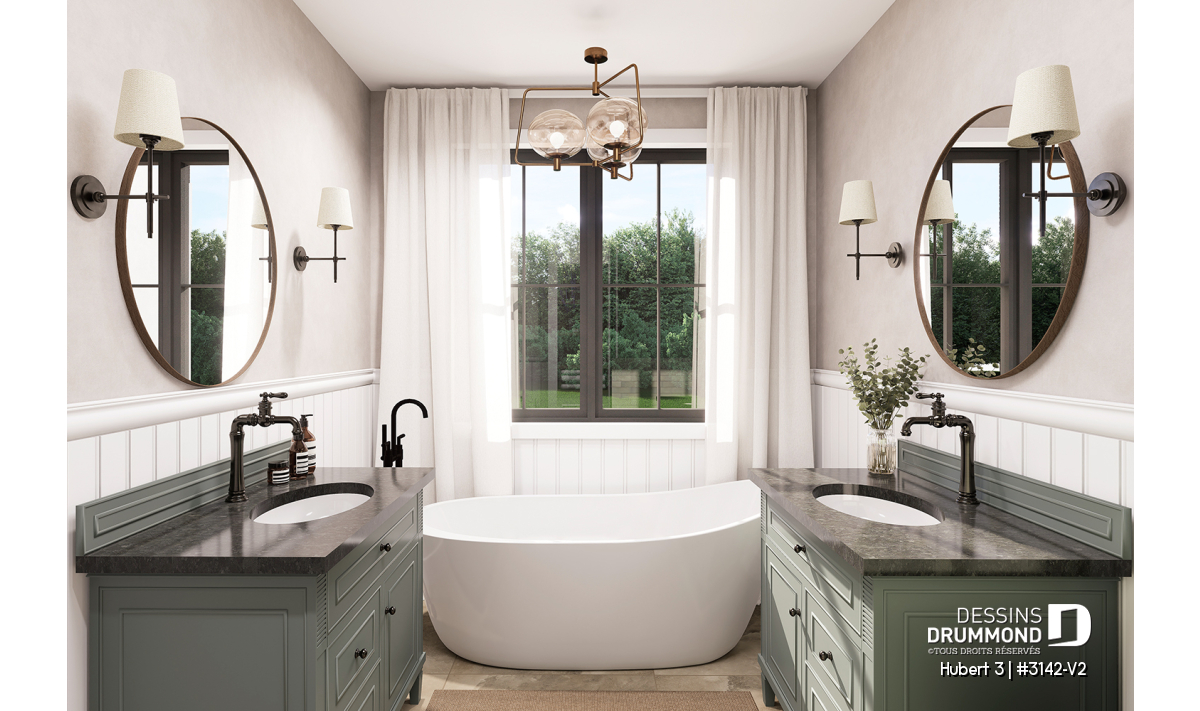 Le plan HUBERT 3 (#3142-V2) propose une maison de plain-pied élégante avec garage double, pensée pour le confort quotidien des familles modernes. Ce modèle fait partie de la collection de maison avec foyer STÛV, reconnue pour ses foyers au design remarquable et à la performance exceptionnelle. Son style moderne et rustique marie chaleur, raffinement et intemporalité dans un équilibre parfaitement maîtrisé. Chaque espace a été conçu pour offrir une circulation fluide, une grande luminosité et une ambiance accueillante.