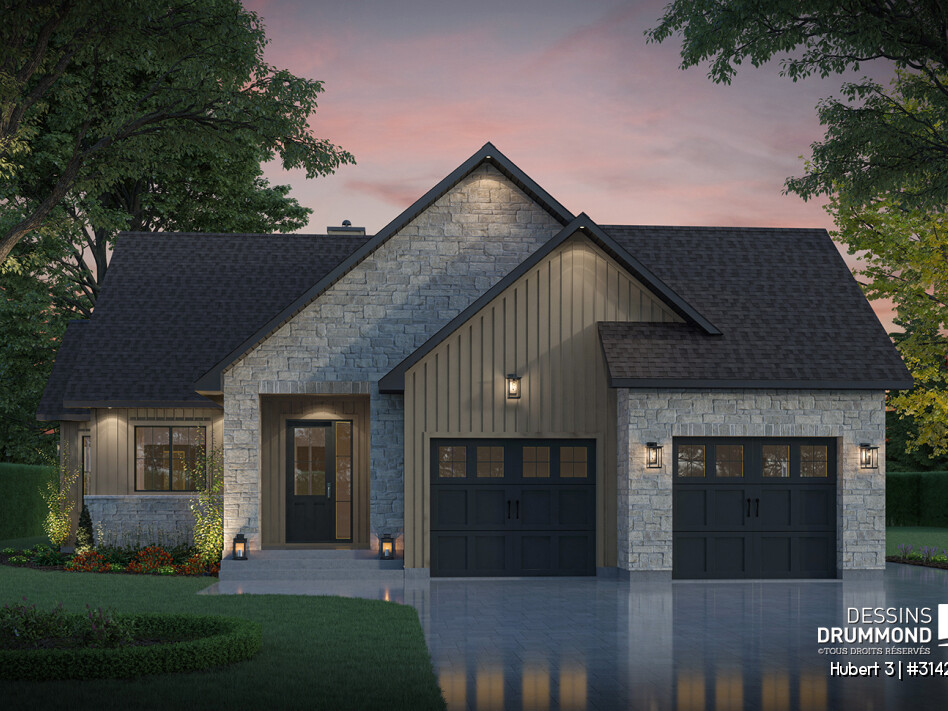 Le plan HUBERT 3 (#3142-V2) propose une maison de plain-pied élégante avec garage double, pensée pour le confort quotidien des familles modernes. Ce modèle fait partie de la collection de maison avec foyer STÛV, reconnue pour ses foyers au design remarquable et à la performance exceptionnelle. Son style moderne et rustique marie chaleur, raffinement et intemporalité dans un équilibre parfaitement maîtrisé. Chaque espace a été conçu pour offrir une circulation fluide, une grande luminosité et une ambiance accueillante.